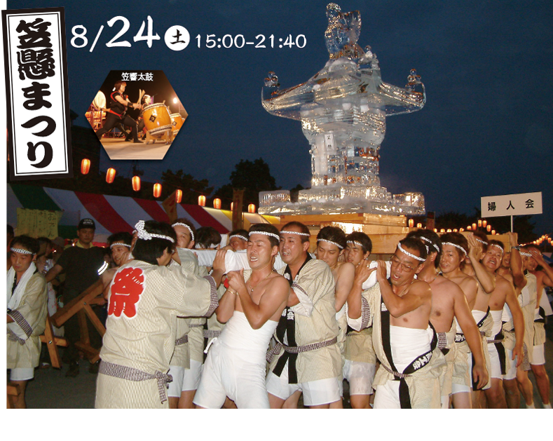 笠懸まつりは、毎年8月に盛大に行われます。目玉の一つ「氷みこし」は、約700kgの氷の彫刻を勇ましい若人が担ぎ、迫力満点です。他にも八木節や笠響太鼓などが披露され、フィナーレは打ち上げ花火が夜空を彩ります。